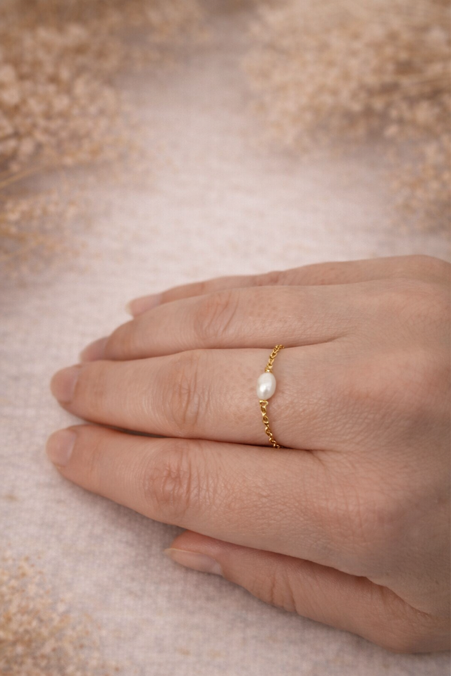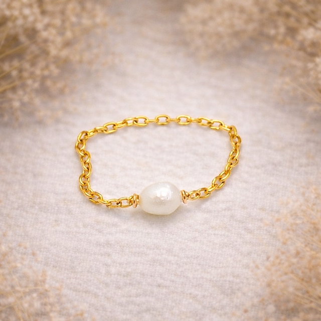Bague délicate, composée d'une chaîne en maille forçat en acier inoxydable 316L, dorée à l'or fin 18K, offrant une élégance intemporelle. Ornée d'une perle de culture en forme de grain de riz de 4 mm, cette bague est disponible dans les tailles de doigt allant de 52 à 58, assurant un ajustement parfait. Chaque bague est confectionnée sur mesure pour s'adapter parfaitement à votre taille de doigt.