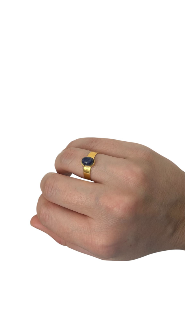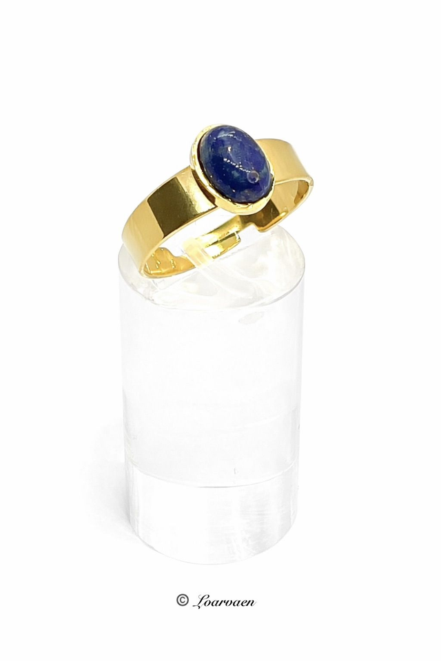 Bague ajustable en acier inoxydable doré à l’or fin, sertie d’une pierre de Lapis Lazuli de 8x6 mm.