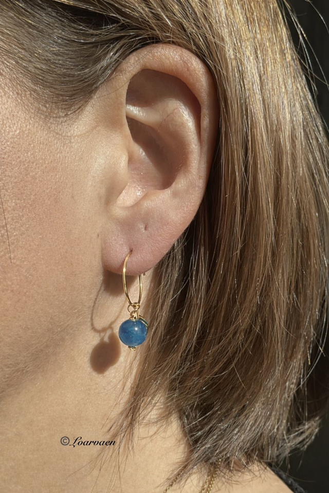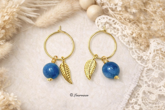 Boucles d’oreilles créoles fines en acier inoxydable doré à l’or fin 18K, ornées d’une élégante pierre Apatite bleue de 6 mm et d’une délicate petite feuille plaqué or 18K. Un bijou raffiné et intemporel.