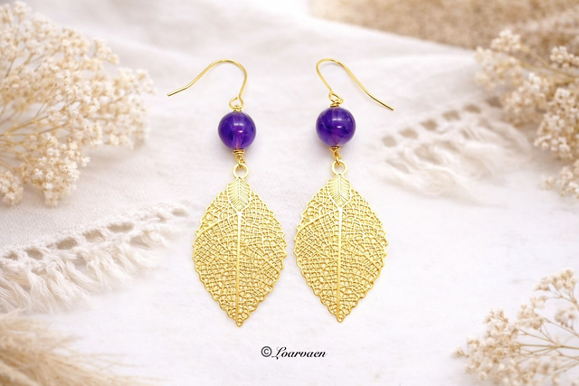 Laissez-vous séduire par l’élégance minimaliste des boucles “Aura”, alliant la douceur vibratoire de l’améthyste à une feuille dorée à l’or fin 24K. Une création délicate et lumineuse qui capte la lumière tout en subtilité.Montées sur un crochet en acier inoxydable doré à l’or fin 24K, ces boucles sont fabriquées à la main en France, avec soin et passion. Les pierres naturelles sont rigoureusement choisies auprès d’un fournisseur local du sud de la France.