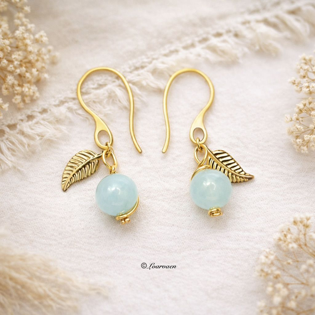Boucles d’oreilles en acier inoxydable doré à l’or fin 18K, ornées de pierres d’aigue-marine de 6 mm et d’une petite feuille dorée.