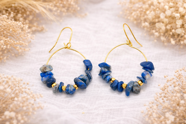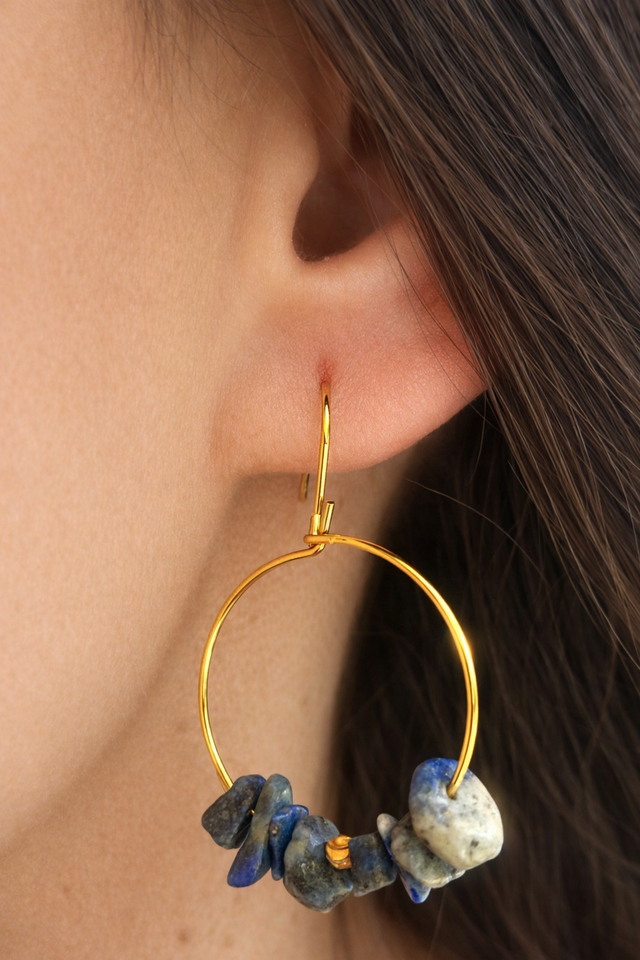 Ces boucles d’oreilles élégantes et aériennes sont composées d’un fin anneau doré à l’or fin, orné de perles naturelles en lapis-lazuli brut. Les nuances profondes de bleu, mêlées à des touches de gris et de blanc, créent un contraste harmonieux, évoquant les mystères des ciels nocturnes et des océans lointains.Chaque pierre, unique par sa forme et sa couleur, apporte une touche d’authenticité et de caractère à cette paire légère et intemporelle. Montées à la main , ces boucles captent la lumière avec délicatesse et s’accordent aussi bien à une tenue du quotidien qu’à une occasion spéciale.