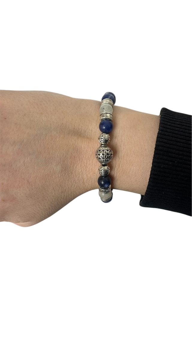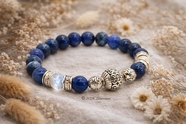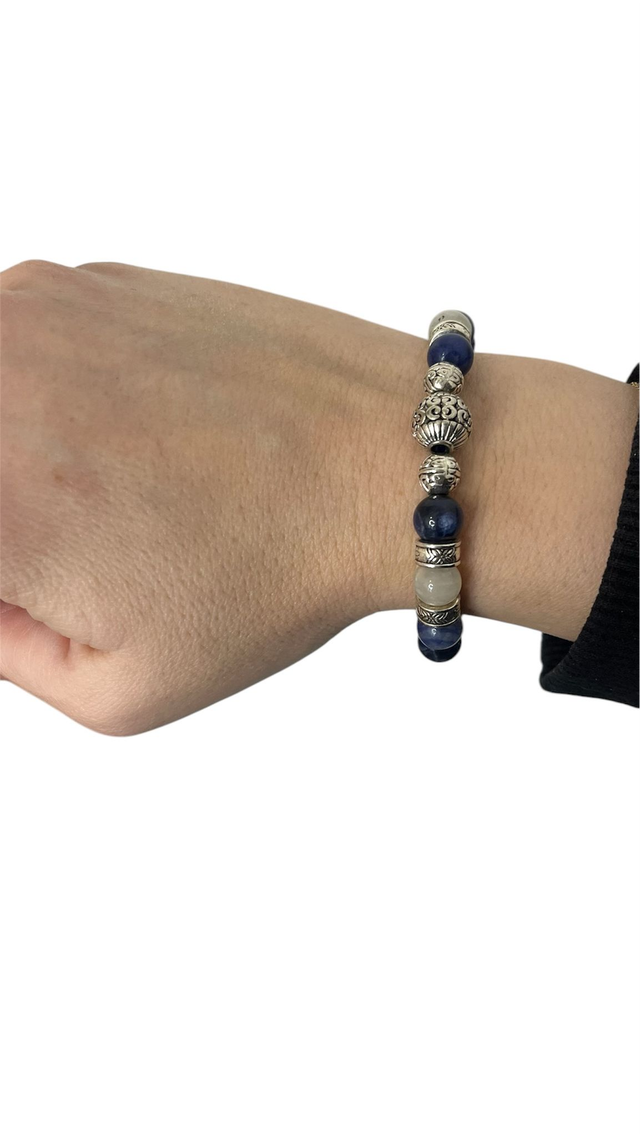 Bracelet en sodalite bleue, orné de deux pierres de lune de 8 mm, monté sur un élastique doublé et agrémenté de bijoux en acier inoxydable argenté au style tibétain.