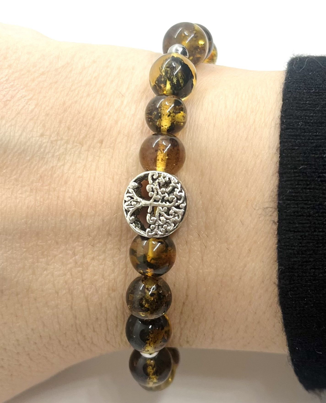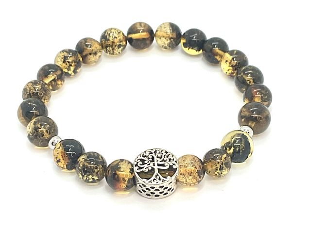 Ce bracelet en ambre miel de 8 mm, provenant de la mer Baltique, est sublimé par un bijou arbre de vie en acier inoxydable, représentant la croissance, l’harmonie et la connexion avec la nature.