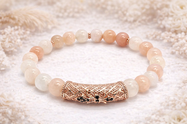 Bracelet en aventurine rose de 8 mm, pierre douce et apaisante, sublimé par de délicats bijoux en acier inoxydable rose gold. En son centre, un élégant tube en acier inoxydable rose gold apporte une touche de raffinement et d’harmonie.