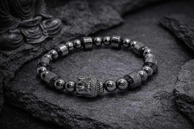 Bracelet élégant et dynamique composé de perles d'hématite rondes de 6 mm et en forme de tubes de 8,5 mm, monté sur un élastique doublé pour une solidité et un confort optimal. Le bijou est sublimé par un pendentif central en forme de tête de Bouddha en hématite, symbole de sagesse, de paix intérieure et d'équilibre spirituel. Cette pièce unique allie les propriétés protectrices et ancrantes de l'hématite avec l'énergie apaisante du Bouddha, pour un accessoire à la fois puissant et raffiné.