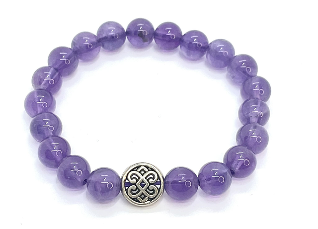 Bracelet élégant en améthyste de 8 mm, monté sur un fil élastique doublé pour un confort optimal. Ce bijou raffiné est orné d'un superbe noeud celtique en acier inoxydable, symbole d'unité et d'éternité. Une pièce intemporelle qui allie la beauté des pierres naturelles à l'élégance du design, parfaite pour ajouter une touche de sophistication à votre look.