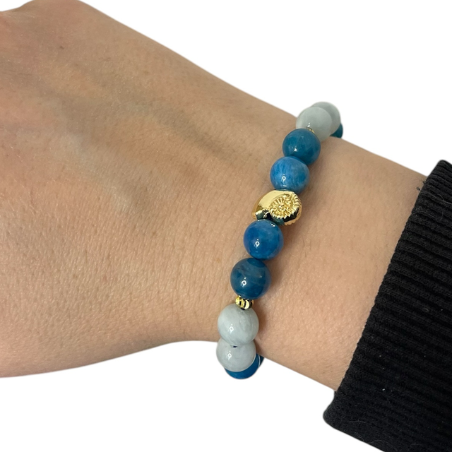 Bracelet en apatite bleue et aigue-marine de 8 mm, inspiré par la beauté des océans. Ces pierres naturelles, l’apatite aux reflets bleu profond et l’aigue-marine aux nuances cristallines, évoquent les eaux tropicales et leurs mystères. Monté sur un élastique doublé, il est agrémenté de bijoux et d’un coquillage en acier inoxydable doré à l’or fin 24K, apportant une touche d’élégance marine et raffinée.