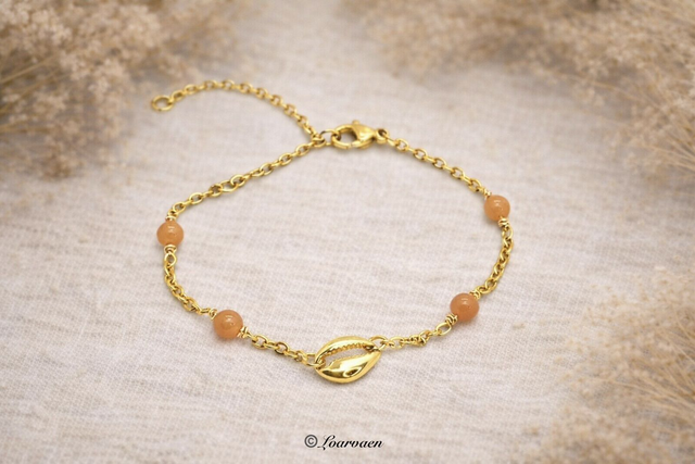 Bracelet rosaire en acier inoxydable doré à l’or fin 18K, sublimé par de délicates aventurines orange, pierres de vitalité et de créativité.En son centre, un coquillage plaqué or 24K, symbole d’évasion et d’harmonie, apporte une touche marine et raffinée à ce bijou élégant.Un bracelet lumineux et énergisant, parfait pour une touche de chaleur et d’élégance au quotidien.