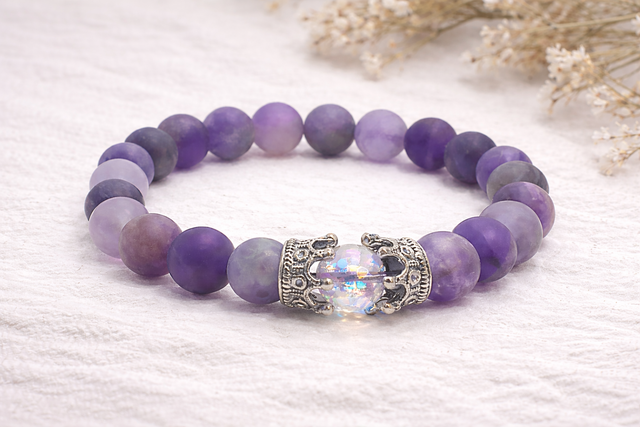 Ce bracelet élégant met en avant des perles d'améthyste mate de 8 mm, dont les teintes violettes profondes et la finition douce apportent une touche de sérénité. Au centre, une délicate couronne en acier inoxydable entoure un quartz aura, dont les reflets irisés captent magnifiquement la lumière. Monté sur un fil doublé pour garantir résistance et flexibilité, ce bijou allie confort et durabilité. Une pièce raffinée qui allie beauté naturelle et énergie positive, parfaite pour ajouter une touche de chic et de bien-être à votre quotidien.