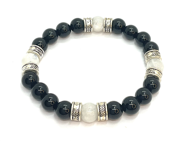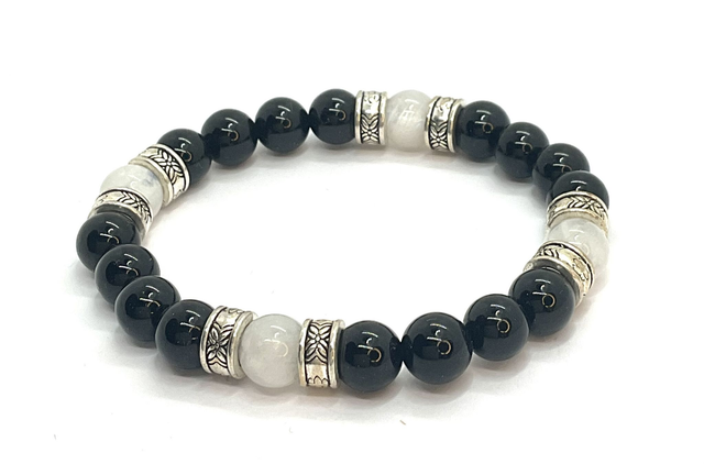 Bracelet en onyx noir et pierre de lune blanche de 8 mm, monté sur un fil élastique doublé pour plus de confort et de résistance.L’onyx noir, pierre de protection et de stabilité, aide à renforcer la confiance en soi et à éloigner les énergies négatives. Associée à la pierre de lune blanche, symbole de douceur, d’intuition et d’harmonie, cette combinaison crée un équilibre entre force intérieure et sérénité.Sublimé par des intercalaires et des bijoux en acier inoxydable, ce bracelet allie élégance intemporelle et vertus énergétiques, offrant un bijou à la fois raffiné et puissant.