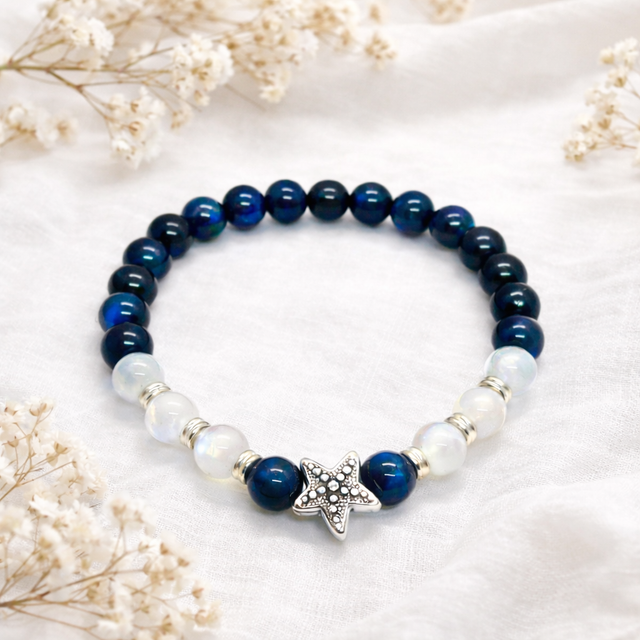 Plongez dans l’élégance du bleu profond avec ce bracelet en Œil de Tigre bleu et Pierre de Lune, sublimé par une délicate étoile argentée.