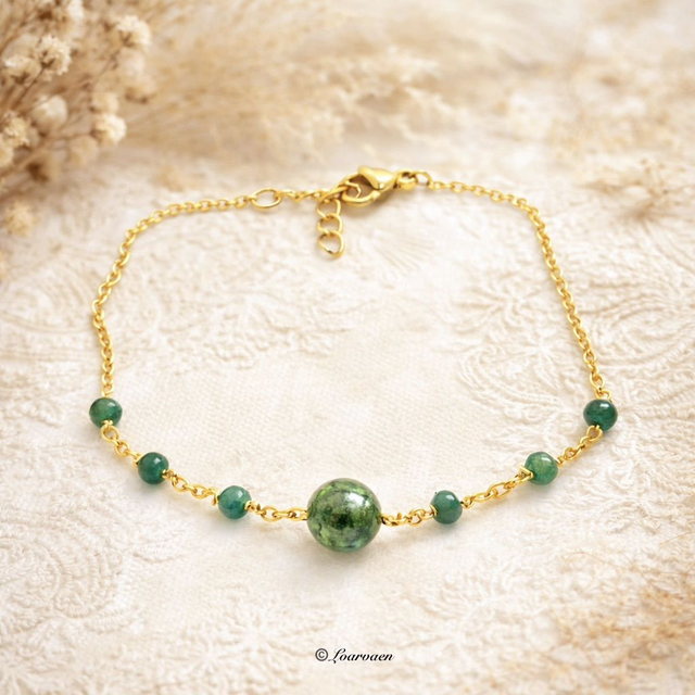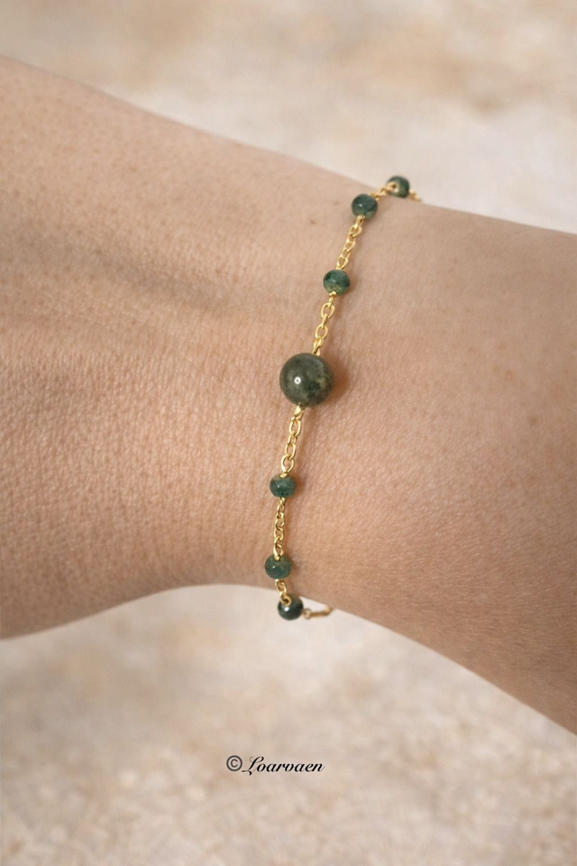 Bracelet chaîne fine plaqué or 24K, sublimé par l’éclat vibrant de l’émeraude et la douceur naturelle de l’agate mousse, pour une alliance élégante entre raffinement et harmonie.