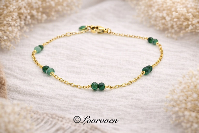 Bracelet en maille fine en acier inoxydable, doré à l’or fin 18K, sublimé par de délicates pierres d’émeraude facettées de 3 mm, alliant éclat et élégance intemporelle.