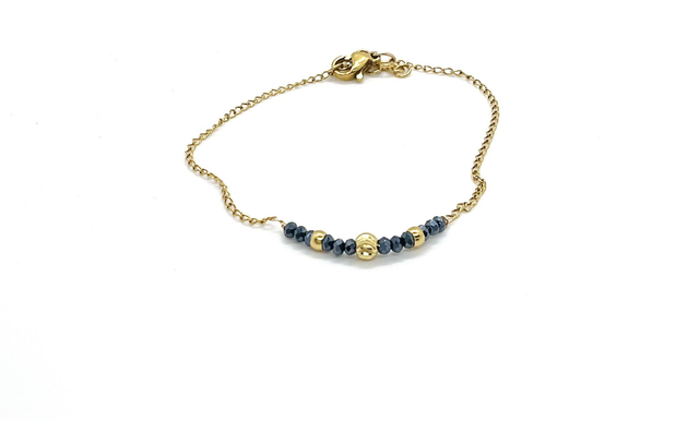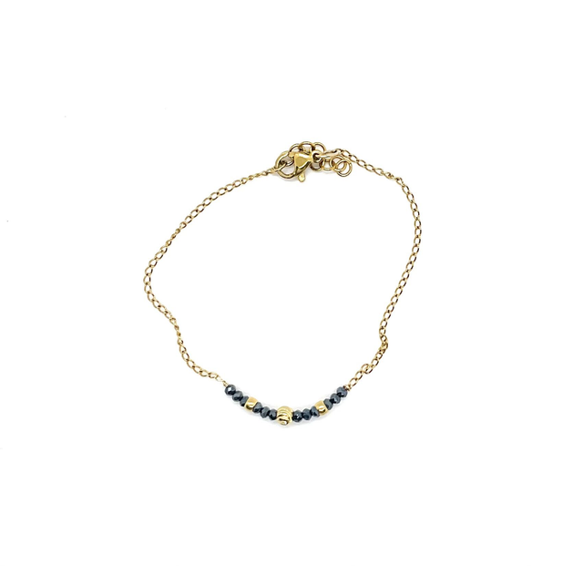 Bracelet fin et élégant en maille forçat en acier inoxydable doré à l’or fin, orné de pierres d’hématite facettées de 2 mm, sublimé par des perles et des intercalaires dorés à l’or fin 24K.