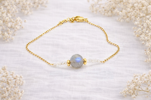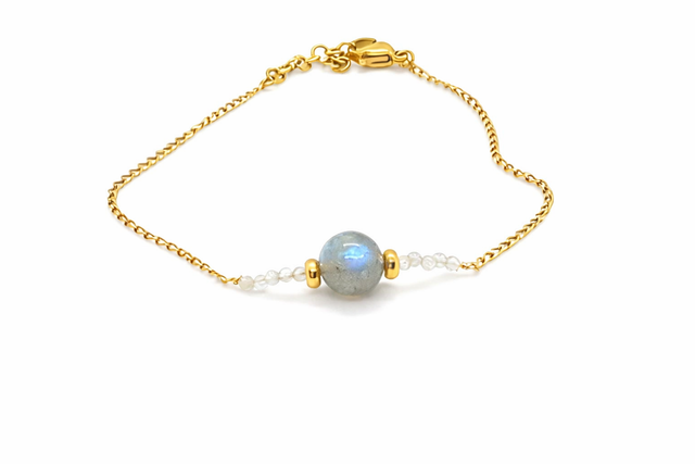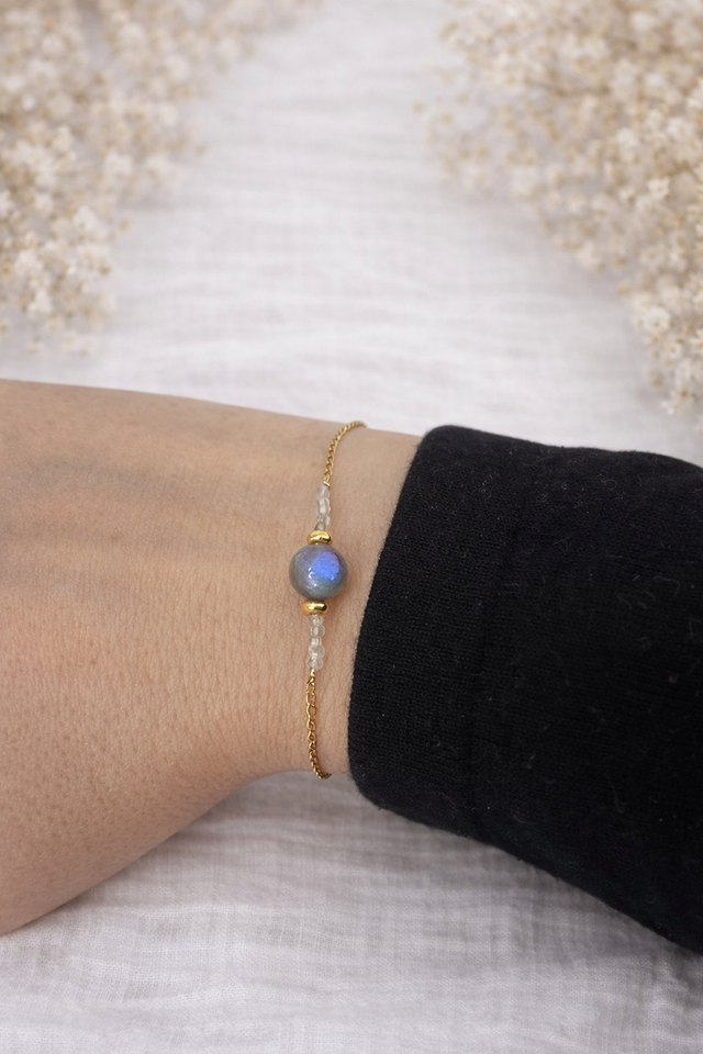 Bracelet fin et élégant en maille forçat en acier inoxydable doré à l’or fin 18K, sublimé par des pierres de labradorite entourant une labradorite centrale de 6 mm, rehaussée de deux intercalaires plaqué or 18K.