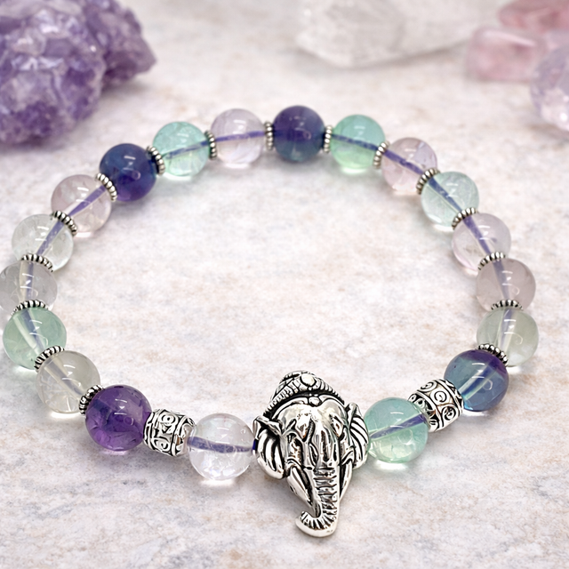 Bracelet en fluorite arc en ciel de 8 mm, pierre aux nuances envoûtantes réputée pour favoriser la clarté d’esprit et l’harmonie. Chaque pierre est sublimée par un délicat intercalaire, mettant en valeur en son centre une majestueuse tête de Ganesh en acier inoxydable, symbole de sagesse et de prospérité.