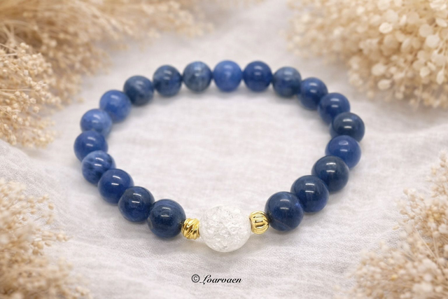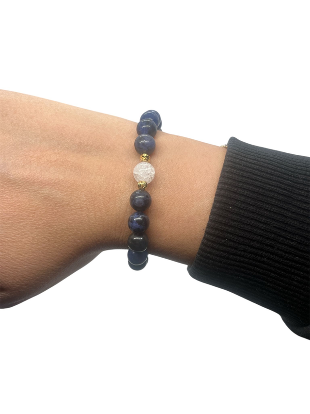 Ce bracelet marie la profondeur bleutée de la sodalite à la pureté lumineuse du cristal de roche craquelé, créant un contraste harmonieux et élégant.