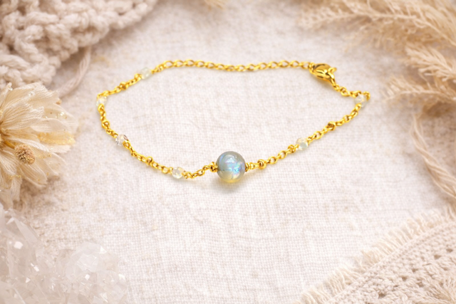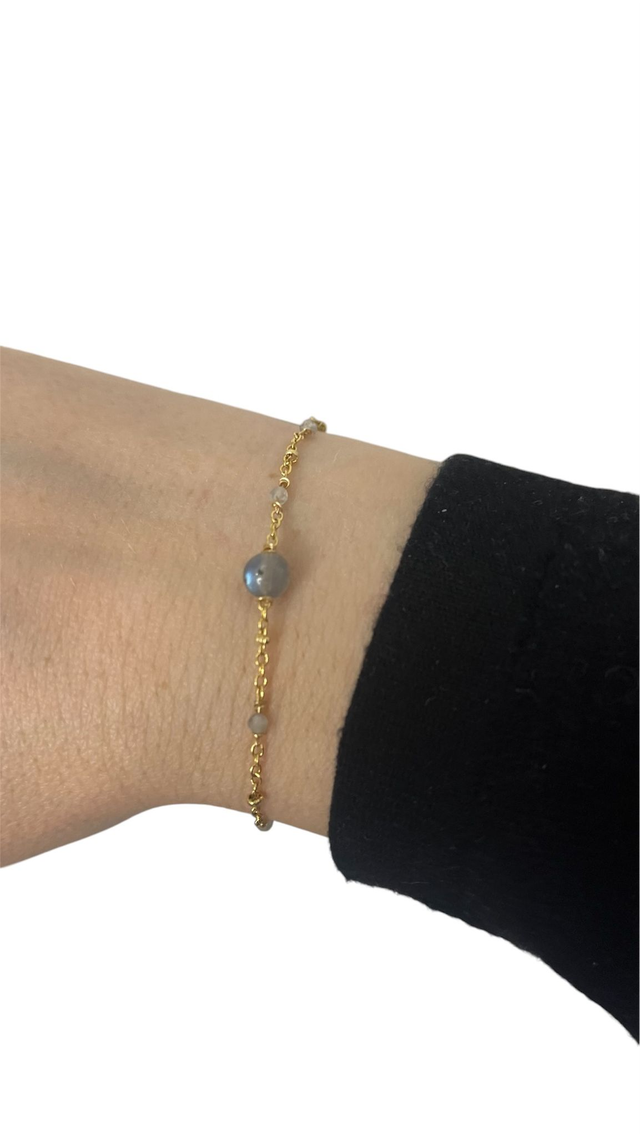 Ce délicat bracelet en acier inoxydable doré à l’or fin 18K met en valeur la labradorite, pierre aux reflets mystiques reconnue pour ses vertus protectrices et son pouvoir d’éveiller l’intuition. Son design raffiné se compose de fines perles facettées de 2 mm, sublimées par une pierre centrale de labradorite de 6 mm, apportant une touche d’élégance intemporelle.