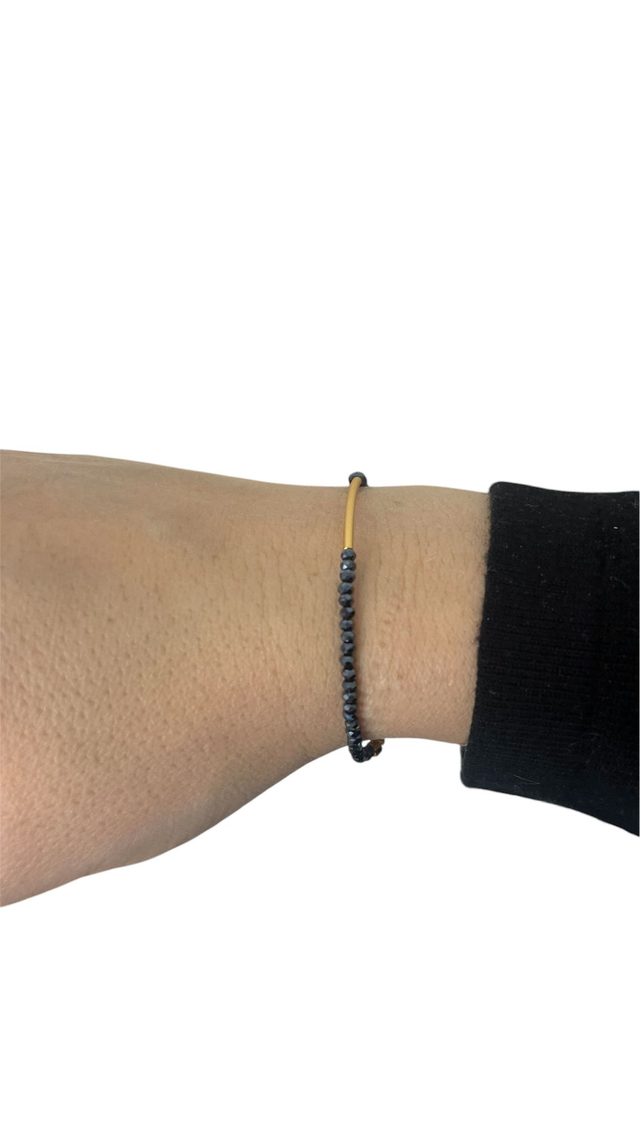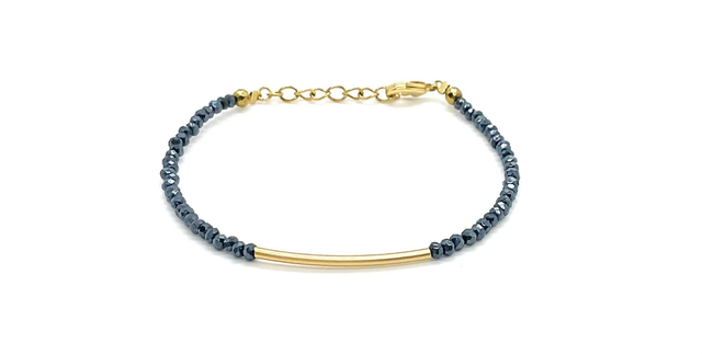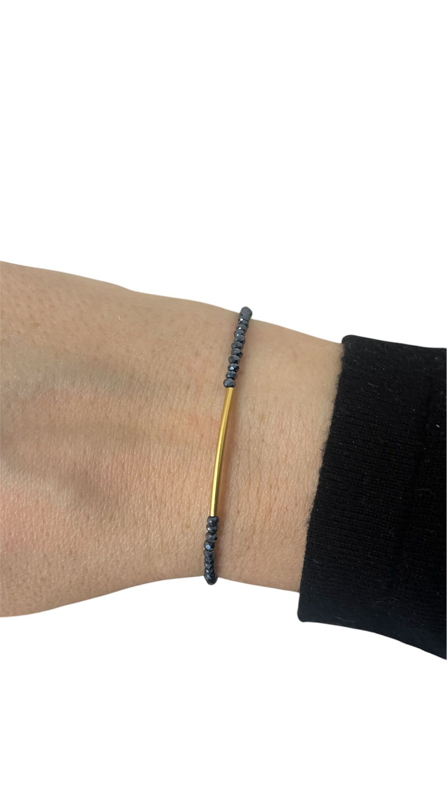 Bracelet fin et délicat en pierres d’hématite facettées de 2 mm, sublimé par un élégant tube doré à l’or fin 24K.