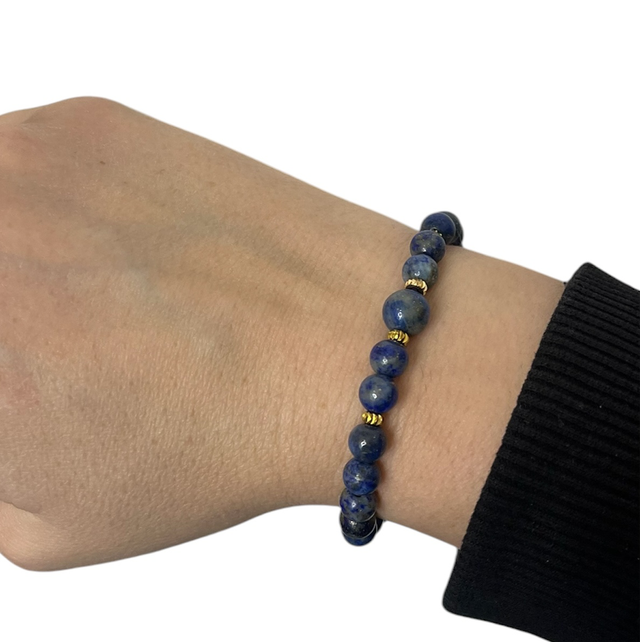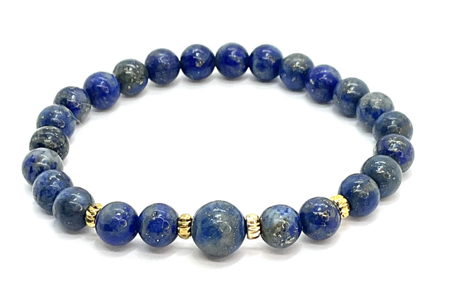 Bracelet en lapis-lazuli d'Afghanistan, composé de perles de 6 et 8 mm, monté sur un élastique doublé. Sublimé par des bijoux intercalaires en acier inoxydable plaqué or 24K, il met en valeur l’éclat profond et les nuances dorées naturelles de cette pierre précieuse prisée depuis l’Antiquité.