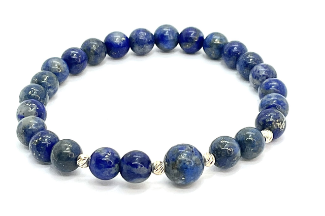 Bracelet en lapis-lazuli d'Afghanistan, composé de perles de 6 et 8 mm, monté sur un élastique doublé. Cette pierre aux nuances bleu profond, parsemée de subtils éclats dorés de pyrite, est mise en valeur par des bijoux intercalaires en acier inoxydable plaqué argent, ajoutant une touche d’élégance intemporelle.