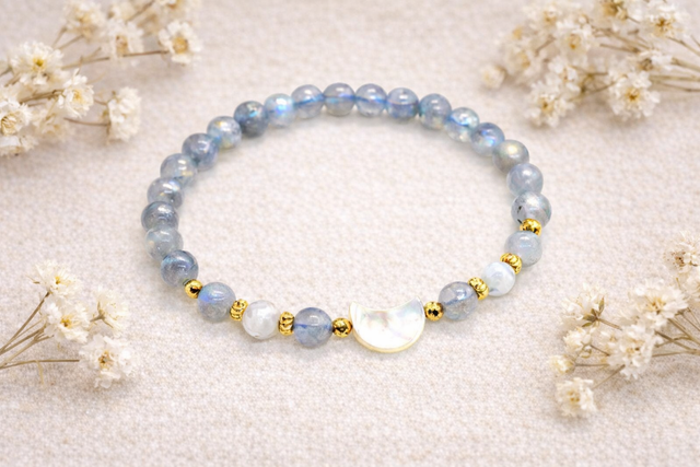 Bracelet en labradorite claire, pierre aux reflets subtils et envoûtants, reconnue pour ses vertus protectrices et apaisantes, harmonieusement associée à des hématites dorées, symboles de force et d’ancrage. En son centre, une lune nacrée élégante, incarnation de l’intuition et de la sérénité, est magnifiée par de délicats bijoux plaqué or 24K, entourant deux pierres de lune blanches. Monté sur un fil élastique doublé, ce bracelet allie éclat, énergie et raffinement pour un bijou aussi protecteur que raffiné.