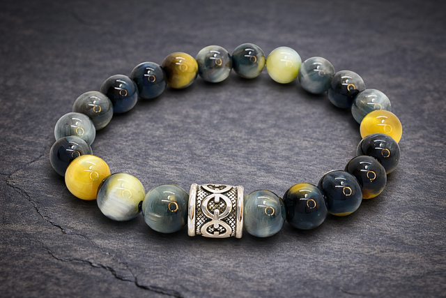 Bracelet en œil de tigre jaune et bleu de 8 mm, une pierre puissante alliant la protection et la clarté mentale du bleu à la force et la confiance en soi du jaune doré. Son éclat chatoyant évoque l’énergie et la sagesse, offrant un équilibre parfait entre intuition et ancrage. En son centre, un bijou d’inspiration celte en acier inoxydable argenté, symbole d’éternité et de spiritualité, vient sublimer l’ensemble. Monté sur un fil élastique doublé pour plus de résistance et de confort, ce bracelet allie puissance, élégance et mysticisme.