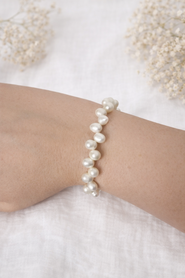 Bracelet en perles de culture d’eau douce du Japon, symbole d’élégance et de pureté, soigneusement monté sur un fil en acier inoxydable doré câblé pour une finition à la fois raffinée et résistante. Ce bijou intemporel allie la douceur nacrée des perles à l’éclat du métal doré, offrant une touche de sophistication subtile et délicate.