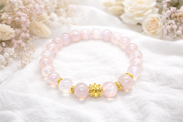 "J’ai imaginé ce bracelet comme un talisman de douceur et de lumière. Chaque perle de quartz rose aura est une bulle d’amour inconditionnel, une vibration délicate pour apaiser le cœur et nourrir l’âme. »