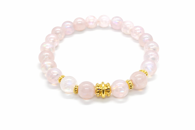 Le bracelet Seren an Ael est composé de perles en quartz rose aura de 8 mm, une pierre subtilement iridescente qui allie les vertus du quartz rose à une aura lumineuse et angélique. Le cœur du bijou est orné d’un intercalaire plaqué or 24k délicatement ciselé, flanqué de deux perles plaquées or torsadées, pour une finition à la fois raffinée et spirituelle.