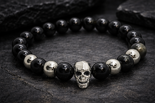 Bracelet unique en pierres naturelles d'obsidienne céleste dorée, monté sur élastique doublé avec des détails raffinés en acier inoxydable. Les perles d'obsidienne, aux nuances profondes et mystérieuses, sont sublimées par une tête de mort audacieuse, incrustée de petits cristaux noirs au niveau des yeux, apportant une touche de mysticisme et de caractère. Ce bijou audacieux combine élégance, protection et une énergie forte, parfait pour ceux qui recherchent un accessoire à la fois original et puissant.