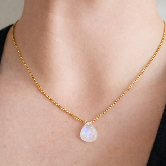 Collier en acier inoxydable doré à l’or fin 18K, alliant élégance et durabilité. Orné d’une magnifique pierre de lune briolette, cette pièce apporte une touche lumineuse et raffinée à votre tenue, avec des éclats doux et irisés qui captivent la lumière.