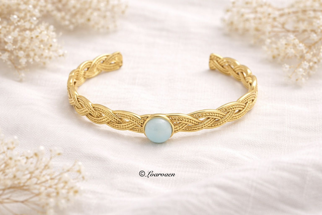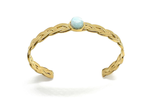 Superbe jonc tressé réglable en acier inoxydable doré à l'or fin 24K, orné d'une pierre de Larimar