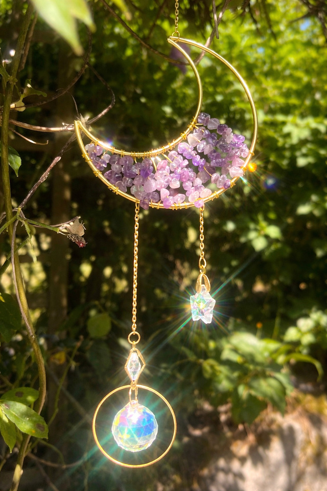 Fait main, cet attrape-soleil marie un croissant de lune en laiton doré serti d’améthystes naturelles, symbole de sérénité, à des pampilles en cristal qui diffusent de superbes reflets arc-en-ciel. Accrochez-le près d’une fenêtre ou au jardin pour illuminer votre espace d’une touche féerique et apaisante. Hauteur env. 25 cm. Largeur lune env. 10 cm.
