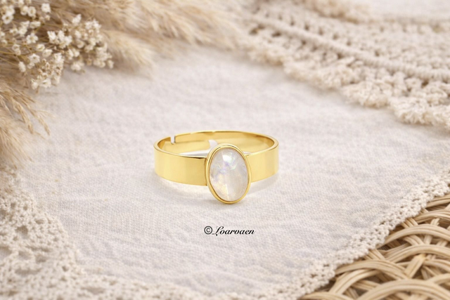 Cette bague allie avec élégance la solidité de l’acier inoxydable à la brillance subtile de l’or fin 18K, pour un contraste moderne et sophistiqué. La pierre de lune, délicatement polie et plate (8×6 mm), capte la lumière et révèle de magnifiques reflets irisés aux nuances douces et lumineuses, apportant une touche mystique et unique à votre look.