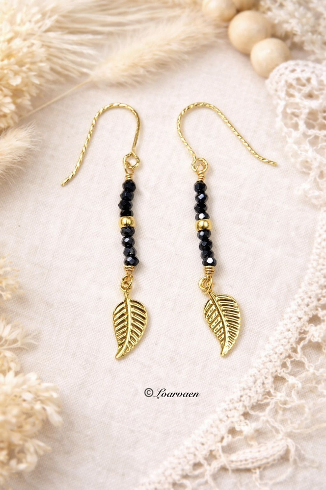 Crochets d’oreille en or laminé 14K au fini diamanté, ornés de pierres pendantes en hématite facettées de 2,4 mm, sublimés par des perles plaqué or 18K et agrémentés d’une délicate feuille au fini plaqué or 18K.